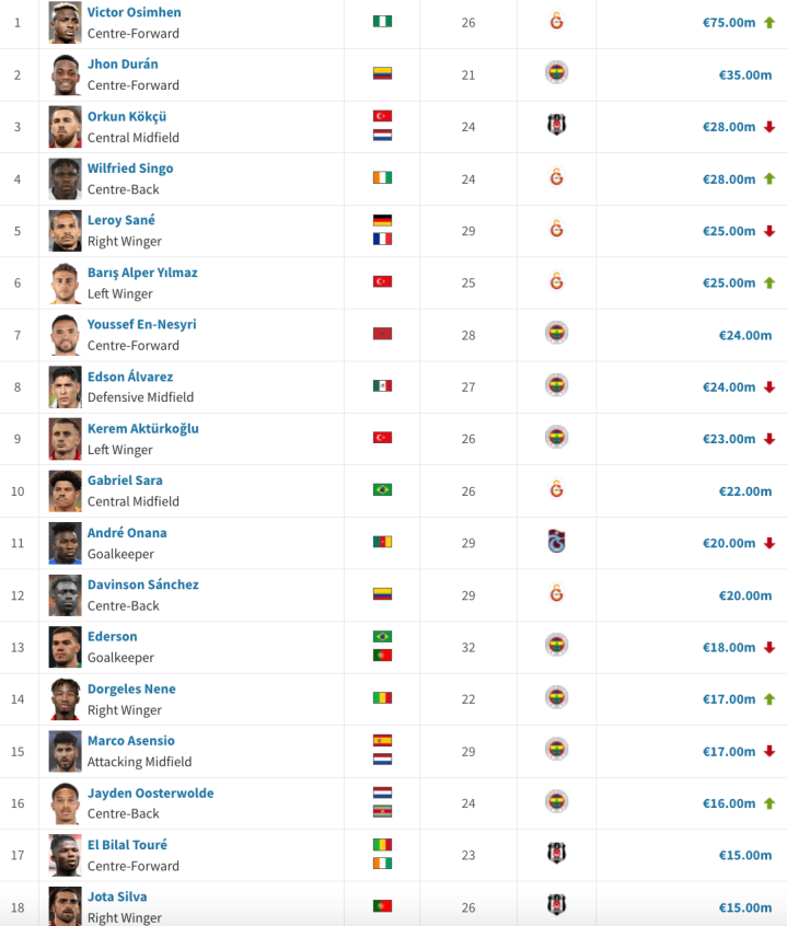 在身价榜单中,租借效力费内巴切的哥伦比亚射手杜兰以3500万欧排名第二。贝西克塔斯的克克丘虽下跌200万欧至2800万欧,但仍位列第三,他与今夏以3080万欧加盟加拉塔萨雷的后卫辛戈并列。辛戈的身价则上涨300万欧至2800万欧。